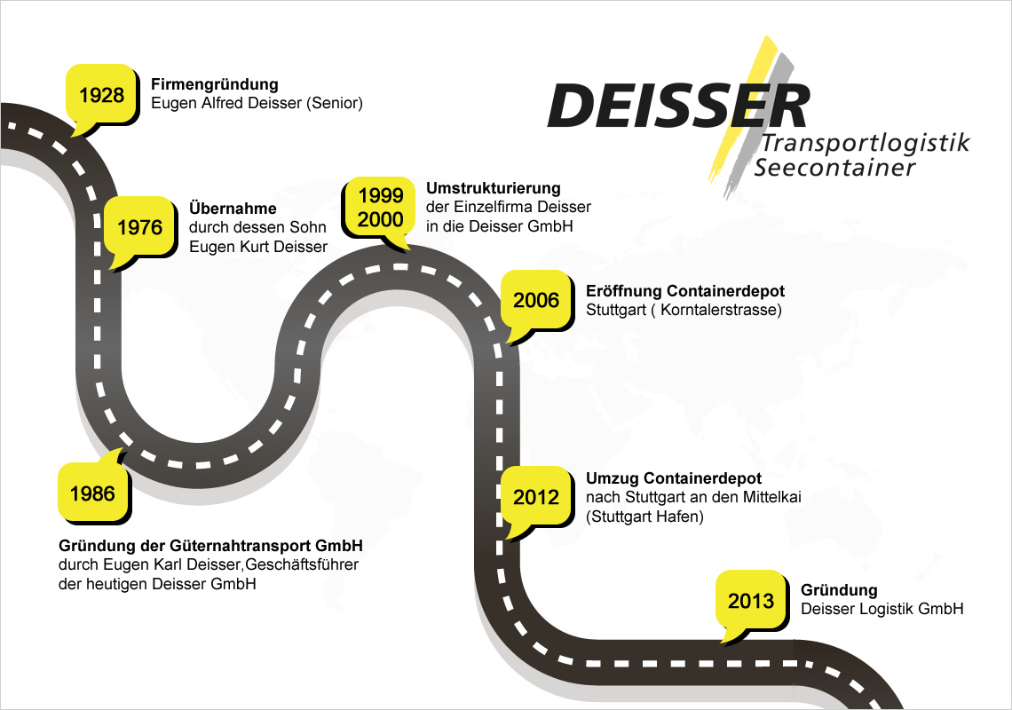 Das 1928 gegründete Familienunternehmen Deisser GmbH ist heute ein führendes Unternehmen im Bereich Transportlogistik und Seecontainer im süddeutschen Raum mit einem umfangreichen Leistungsspektrum im "Kombinierten Güterverkehr". Unser Unternehmen baut auf jahrzehntelange Erfahrung und ist sowohl deutschlandweit als auch international tätig. Mit unserem logistischen Know-How und unserem Spezial-Equipment, das in der Form regional und im Umkreis von 100 Km einzigartig ist, bieten wir unseren Kunden individuelle und bedarfsorientierte Logistiklösungen. Mit unserer logistischen Kompetenz, herausragenden Qualität und absoluten Zuverlässigkeit erbringen wir und unsere Mitarbeiter täglich Spitzenleistungen für unsere Kunden und Partner. Der Zeitstrahl zeigt die Entwicklung unseres Unternehmens von der Gründung bis zum heutigen Unternehmensstatus.